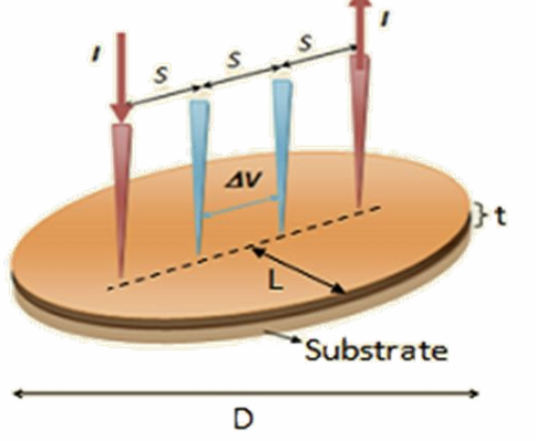 Resistivity measurement of a wafer or any other surfaces (sheet resistance) using four in line probes of constant spacing contacting the surface of the material. A current is passed through the outer two probes and voltage is measured from the inner probes.